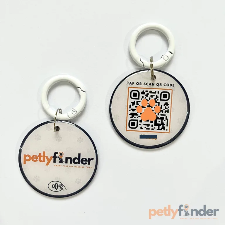 The PVC Key SmartPet Tag V2—waterproof, tap or scan QR to view pet profiles. Free PetlyFinder app, no subscription, 3-month replacement guarantee.