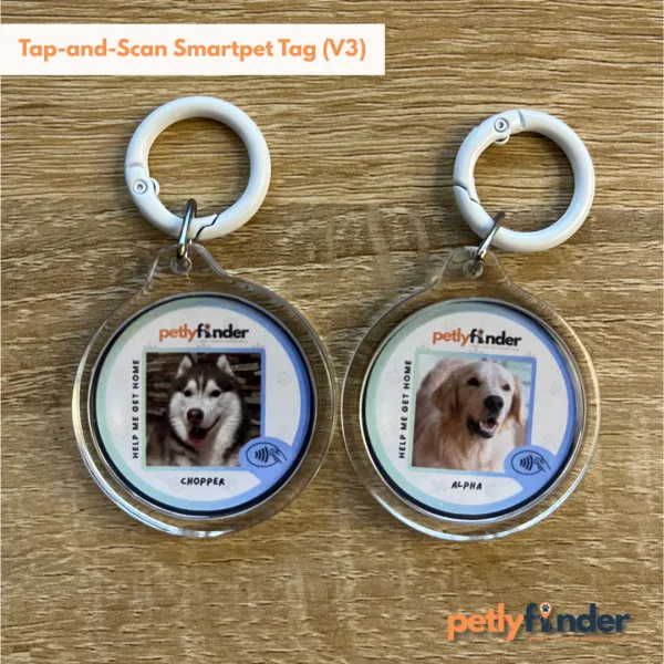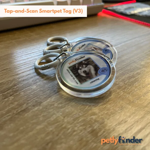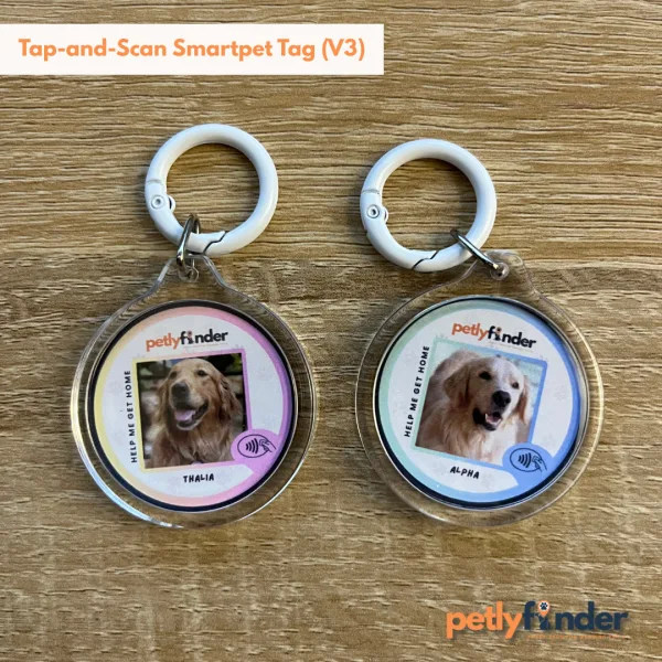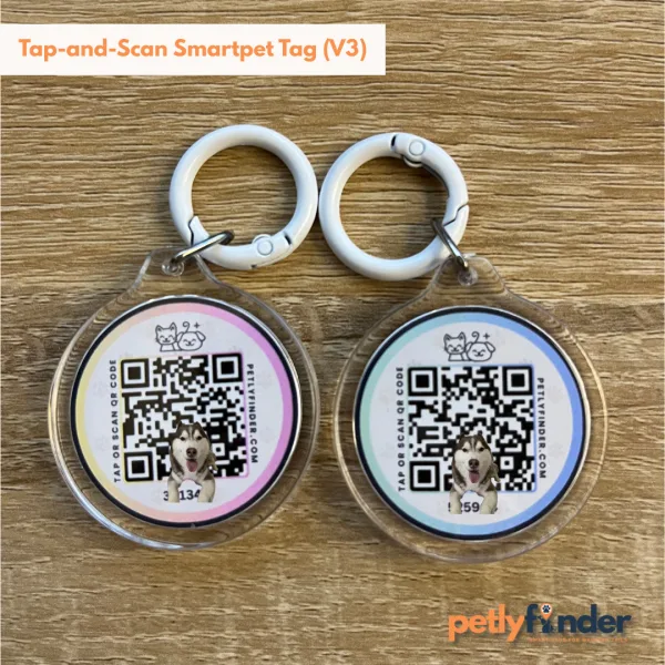 Custom SmartPet Tag V3—personalized acrylic tag with QR or tap for pet profile access. Free PetlyFinder app, no subscription, 1-month replacement.